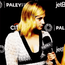 Lili Reinhat at PaleyFest, being interviewed by Extra and showing a subtle reaction.