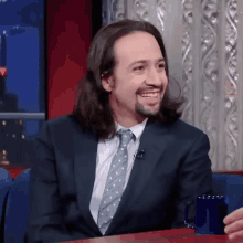 Lin-Manuel Miranda smiling broadly while sitting at a table in a suit and tie.