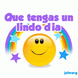 Animated smiley face emoji with a rainbow and stars, wishing 'Have a nice day' in Spanish.
