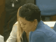 Lindsay Lohan in a courtroom, listening intently to another woman during a legal proceeding.