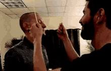 Linkin Park members Chester Bennington and Mike Shinoda playfully hold sticks to their faces in a goofy moment.