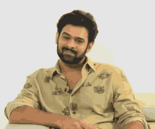 Indian actor Prabhas, known for Bahubali, looks impressed while listening intently.