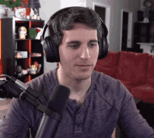 Loganolio makes a funny face while wearing headphones and sitting in front of a microphone.