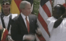George W. Bush makes exaggerated, seemingly awkward gestures while interacting with a man in a white shirt, surrounded by flags.