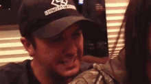 Luke Bryan shares a playful moment, talking and smiling while wearing a 'Southeast Kansas' hat.