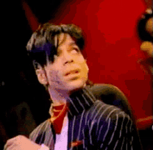 Music icon Prince, wearing a distinctive striped jacket and red cravat, looks contemplative during a performance.