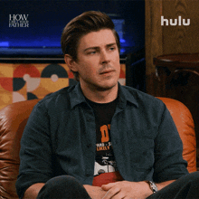 Christopher Lowell as Jesse from How I Met Your Father, sitting in a chair and talking, with Hulu branding.