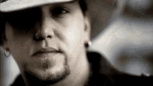 Jason Aldean, wearing a cowboy hat and sporting a goatee, looks seriously into the camera.