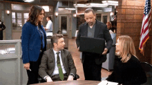 Lieutenant Olivia Benson, Detective Amanda Rollins, Detective Sonny Carisi, and Sergeant Odafin Tutuola review a laptop.