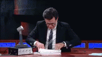 Stephen Colbert intently sifting through a stack of receipts and papers at a desk.