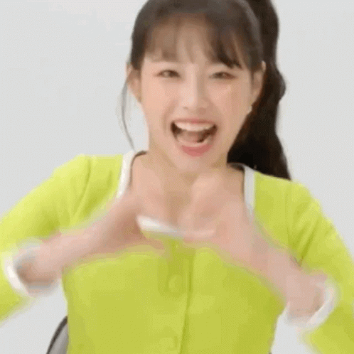 Loona Chuu smiles brightly while making a heart shape with her hands.