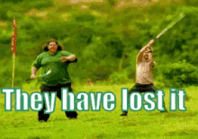 Two people in a grassy field acting erratically, with the caption 'They have lost it'.