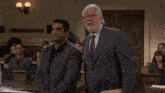 A man in a courtroom scene from Night Court holds up a sign that reads 'Lots o' Jail'.