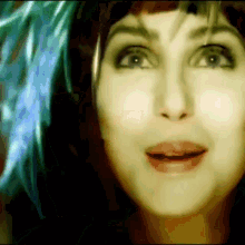 Cher and others singing in a stylized music video with green lighting.