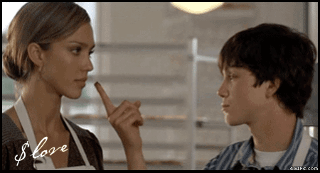 A woman points her finger at a young man's nose, with the word "love" displayed on screen.