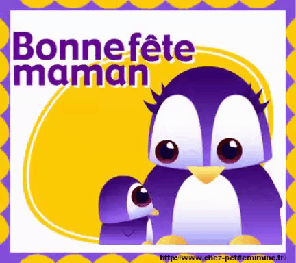 Momo the purple penguin and her baby celebrate Mother's Day with a heartfelt 'Bonne fête maman' message.