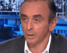 Mehdi makes a funny face in a suit, blinking and moving his mouth slightly, associated with Lpinf Waluigi.