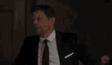 Mark Pellegrino as Lucifer in Supernatural making a funny face in a dark room, wearing a suit and tie.