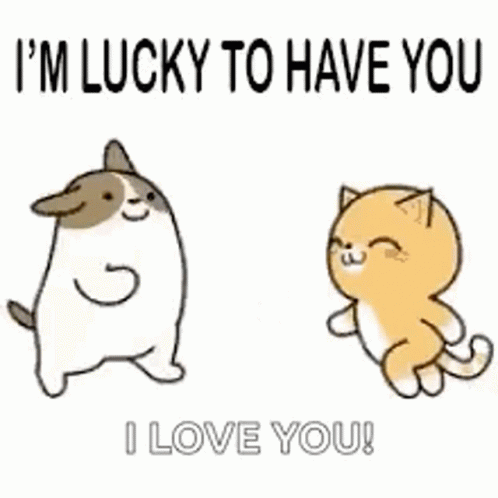 An adorable animated cat and dog share a loving hug, expressing 'I'm Lucky To Have You' and 'I Love You!'