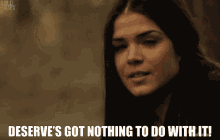 Octavia Blake (Marie Avgeropoulos) delivers the iconic line, "Deserve's got nothing to do with it!" with an intense expression.