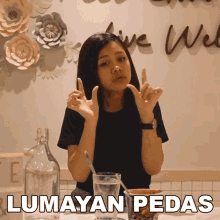 Meli reacts to 'Lumayan Pedas' (Quite Spicy) with enthusiastic hand gestures and two thumbs up, expressing her approval.