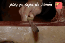 A person expertly slicing a piece of Jamón Ibérico, with the text 'order your ham tapa' displayed.