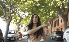Lyna Lotengotodolyna dancing happily on a sunny street lined with trees and buildings.