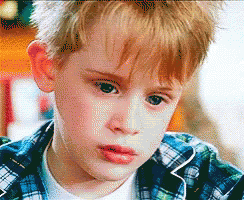 Macaulay Culkin with a surprised and thoughtful expression, wearing a plaid shirt.