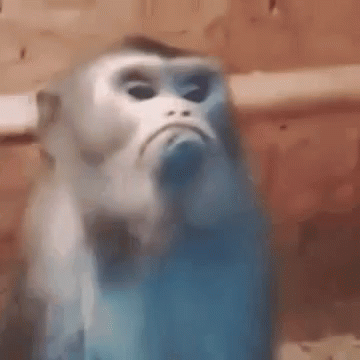 Close-up of a monkey with a sad, frowning, and mad expression, looking thoughtful.