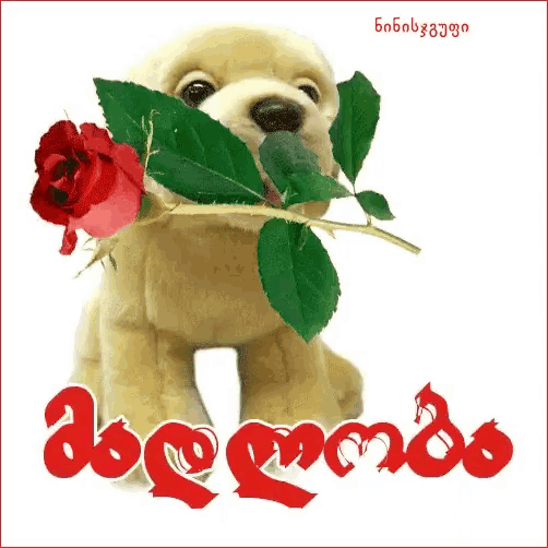A stuffed dog holds a red rose, displaying 'apollo' and a 'Thank You' message.