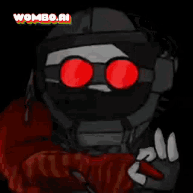 Mag Hank from Madness Combat, a cartoon character with glowing red eyes, animated by WOMBO.AI.