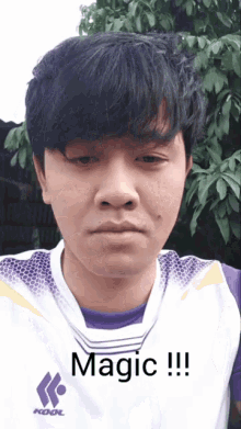 A young man performs a simple hand magic trick, saying 'Magic!' with a confident expression.