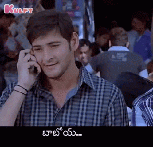 Indian actor Mahesh Babu talks on a cell phone in a crowd, with the Telugu caption 'బాబోయ్'.