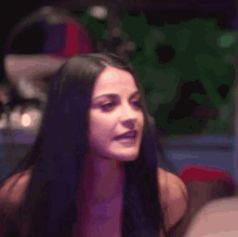 Maite Perroni with long dark hair, looking intently at the camera in a dimly lit setting.