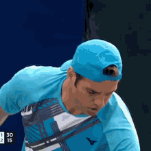 Malek Jaziri delivers a powerful serve during a tennis match, wearing his signature blue cap and shirt.