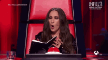 Malu reacts with surprise during La Voz Antena 3 auditions, sitting in a red chair with a notebook.