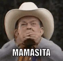 Man in a cowboy hat exclaims 'Mamasita' with exaggerated facial expressions, covering his mouth.