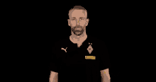 Marco Rose, wearing a Borussia Mönchengladbach shirt, communicates using sign language.