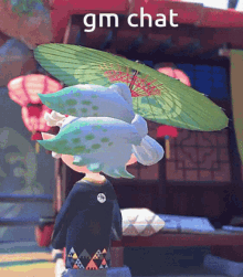 Marie from Splatoon holds a green umbrella in a Japanese-style setting, greeting the chat with "gm chat".