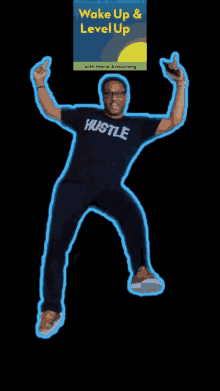 Mario Armstrong dancing energetically in a 'Hustle' shirt, promoting his 'Wake Up & Level Up' podcast.