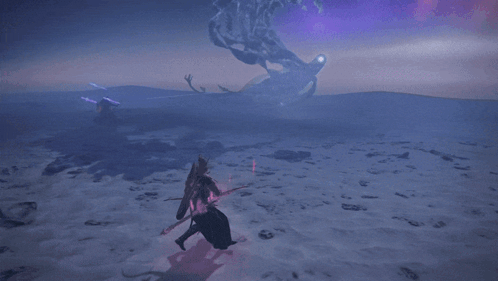 a person in a video game is standing in the middle of a field with a purple sky in the background