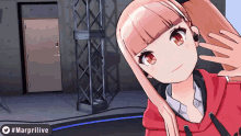 Marpril's 立花鈴, a pink-haired Vtuber, waves cheerfully in a red hoodie, with #Marprilive visible.