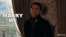 Jonathan Bailey as Lord Anthony Bridgerton proposes with the words 'Marry Me' in a dramatic scene from Bridgerton.