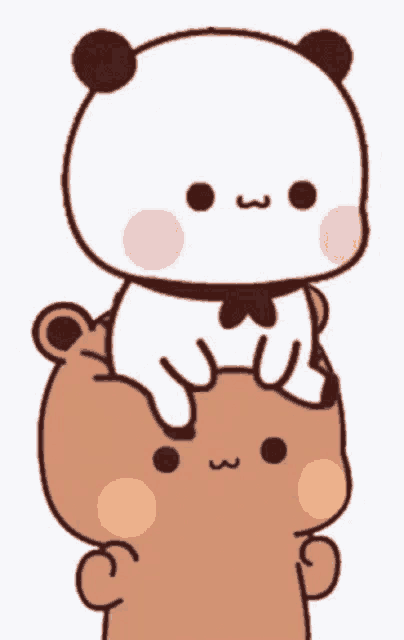 A cute animated panda sits atop a brown bear, both characters featuring rosy cheeks and sweet expressions.