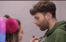 Marta and David share a close, intimate moment, looking into each other's eyes with smiles.