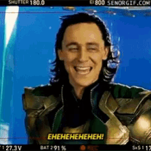 Loki from Marvel laughs hysterically with a wide, mischievous grin.