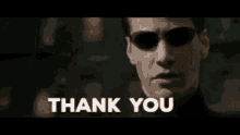 Agent Smith from The Matrix, wearing sunglasses and a suit, says 'Thank You' with a subtle smirk.