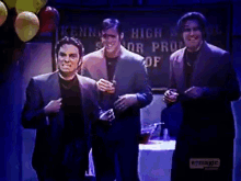 Three men in suits perform a synchronized dance, reminiscent of A Night at the Roxbury.