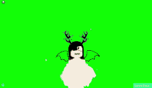 A Roblox character with antlers, an eye patch, and wings, wearing a white gown, against a green screen.