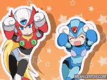 Mega Man Zero and Mega Man characters in a cute, animated style, happily dancing on an orange starry background.